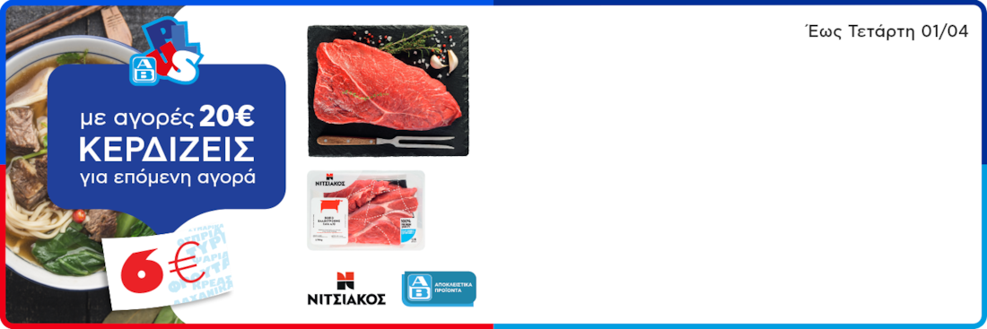 - Κέρδισε επιταγή έκπτωσης 6€ αγοράζοντας 20€ σε όλο το ΝΙΤΣΙΑΚΟΣ ΒΟΕΙΟ Ελληνικής εκτροφής άνω των 5 μηνών, χύμα & τυποποιημένο