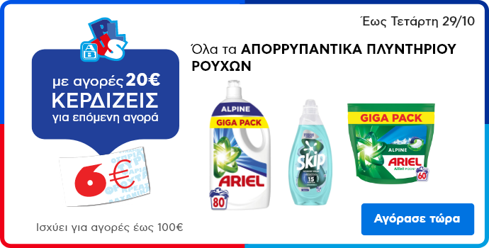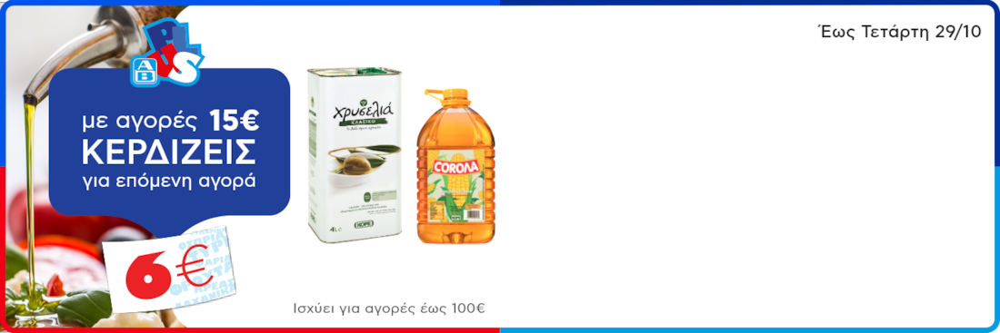 - Κέρδισε επιταγή έκπτωσης 6€ αγοράζοντας 15€ σε όλα τα ΕΛΑΙΟΛΑΔΑ & ΣΠΟΡΕΛΑΙΑ