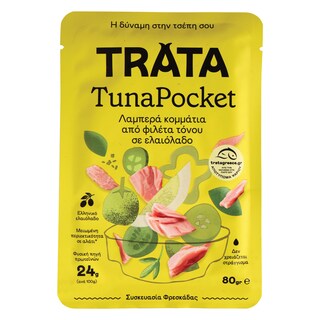 Λαμπερά κομμάτια από φιλέτα τόνου TRATA σε ελληνικό ελαιόλαδο, σε συσκευασία pocket, χωρίς στράγγισμα για άμεση χρήση & απαράμιλλη γέυση! Απογειώνει τα πιο φρέσκα υλικά και δημιουργεί τον απόλυτο Μεσογειακό συνδυασμό γεύσης στο πιάτο σου. Έχεις τη δύναμη στην τσέπη σου!