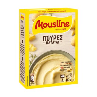 Φτιαγμένος από 99% εκλεκτές πατάτες ο πουρές Mousline συνοδεύει άψογα το κυρίως πιάτο σας. Μπορείτε επίσης να τον απολαύσετε αυτόνομο σαν ένα ελαφρύ γεύμα με ψητά λαχανικά!