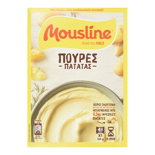 Χωρίς χρωστικές και συντηρητικά, ο πουρές Mousline είναι απόλυτα γευστικός, ενώ δεν έχει λιπαρά, ζάχαρη, αλάτι και δεν περιέχει γλουτένη.