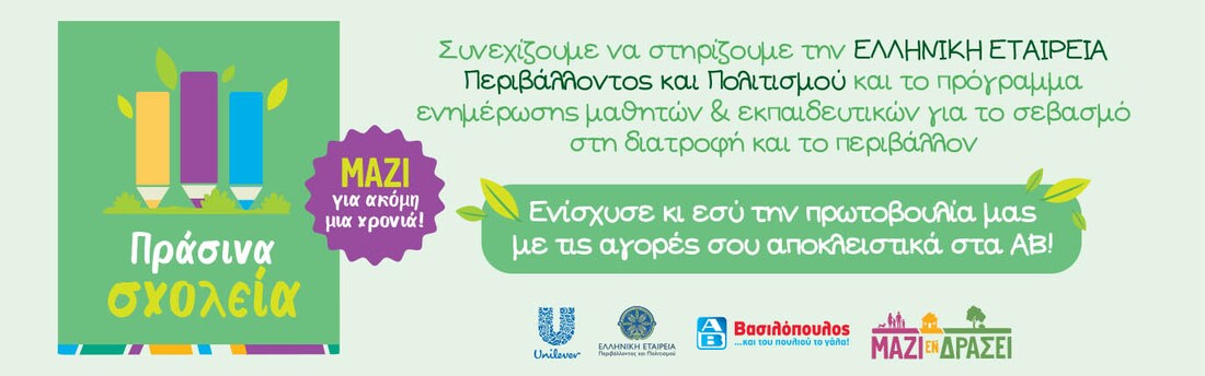 Το 2023 ήταν μια πράσινη χρονιά! Η ΕΛΑΙΣ Unilever και η ΑΒ Βασιλόπουλος επισκέφθηκαν 20 σχολεία σε όλη την Ελλάδα και ενημέρωσαν 663 μαθητές της πρωτοβάθμιας και δευτεροβάθμιας εκπαίδευσης για την αξία της διατροφής στο φυσικό περιβάλλον και την κυκλική οικονομία, σε συνεργασία με την Ελληνική Εταιρεία Περιβάλλοντος και Πολιτισμού.