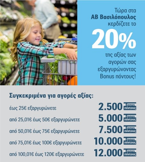 Πραγματοποιώντας τις αγορές σoυ στα καταστήματα ΑΒ Βασιλόπουλος καθώς και στο ηλεκτρονικό κατάστημα του www.ab.gr, με την κάρτα σου Alpha Bank Bonus, κερδίζεις 4 Bonus πόντους για κάθε 1 ευρώ!