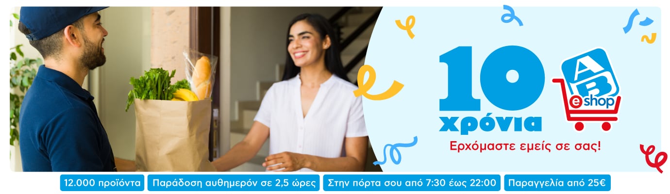 Μαζί σου, κάθε μέρα, εδώ και μια δεκαετία! Το AB Eshop γιορτάζει 10 χρόνια γεμάτα εμπιστοσύνη, εξυπηρέτηση και αγορές στο λεπτό. Δέκα χρόνια τώρα φέρνουμε τις αγορές σου στο χώρο σου με συνέπεια, ασφάλεια και χαμόγελο. Από την πρώτη σου παραγγελία μέχρι σήμερα, συνεχίζουμε να εξελισσόμαστε με έμπνευση τις ανάγκες σου. Γιόρτασε μαζί μας, με μοναδικές προσφορές και εκπλήξεις που ετοιμάσαμε για σένα!