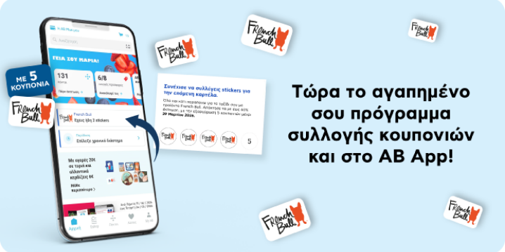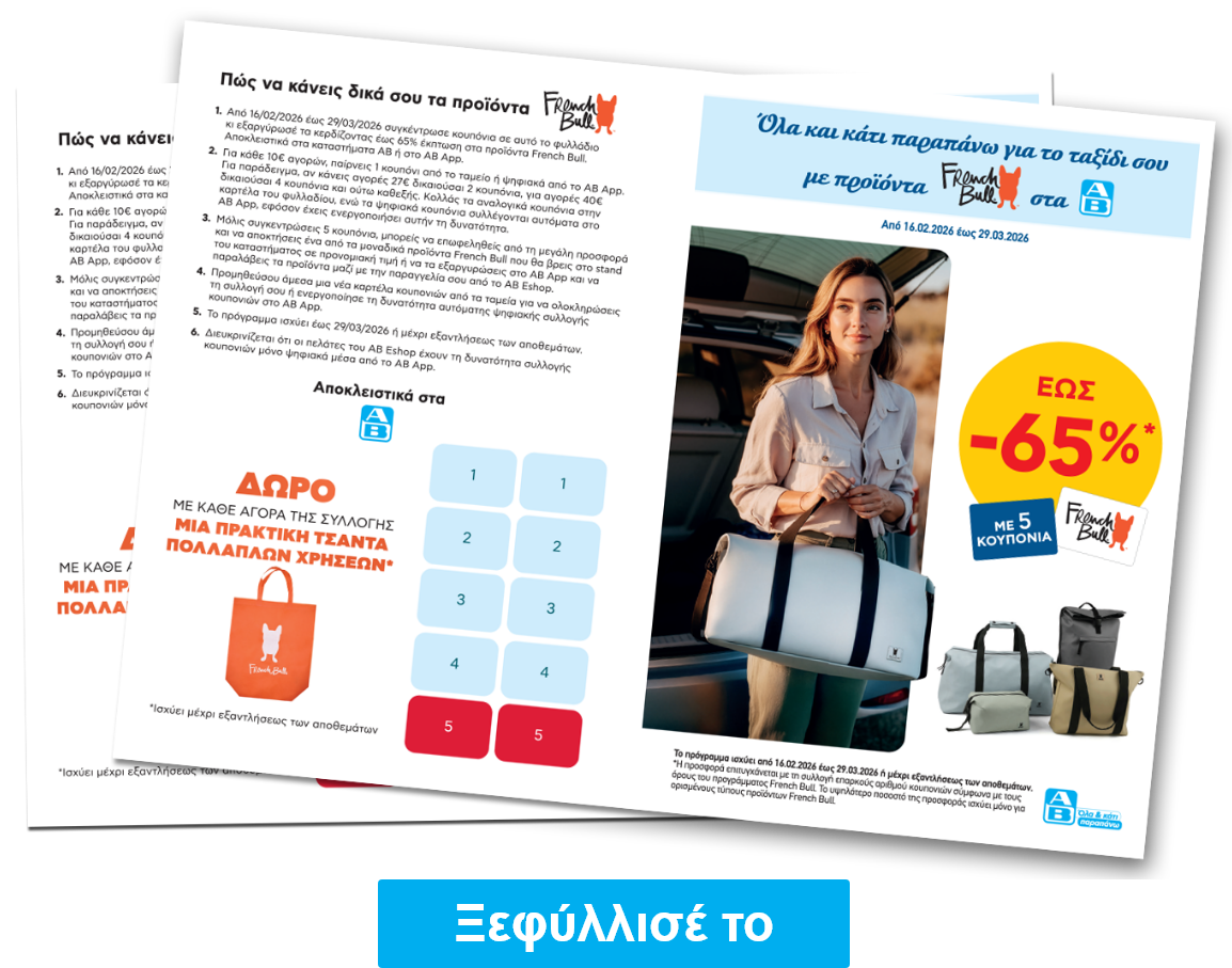 Από 16/02/2026 έως 29/03/2026 συγκέντρωσε κουπόνια σε αυτό το φυλλάδιο και εξαργύρωσέ τα, κερδίζοντας 60% έκπτωση στα προϊόντα FRENCH BULL. Αποκλειστικά στα καταστήματα ΑΒ ή το AB App.