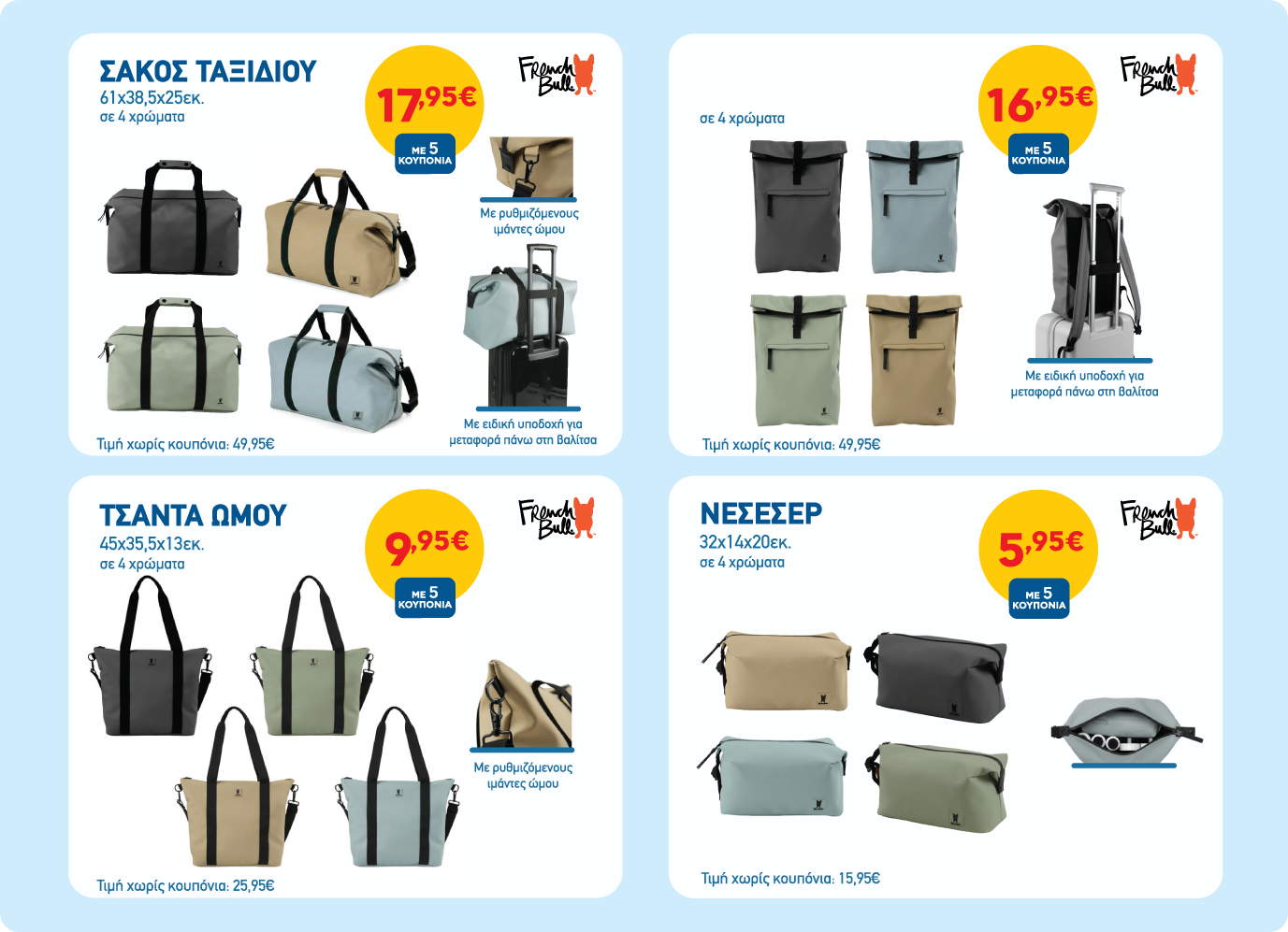 Μόλις συγκεντρώσεις 5 κουπόνια, μπορείς να επωφεληθείς από τη μεγάλη προσφορά και να αποκτήσεις ένα από τα μοναδικά προϊόντα French Bull που θα βρεις στο stand του καταστήματος σε προνομιακή τιμή.